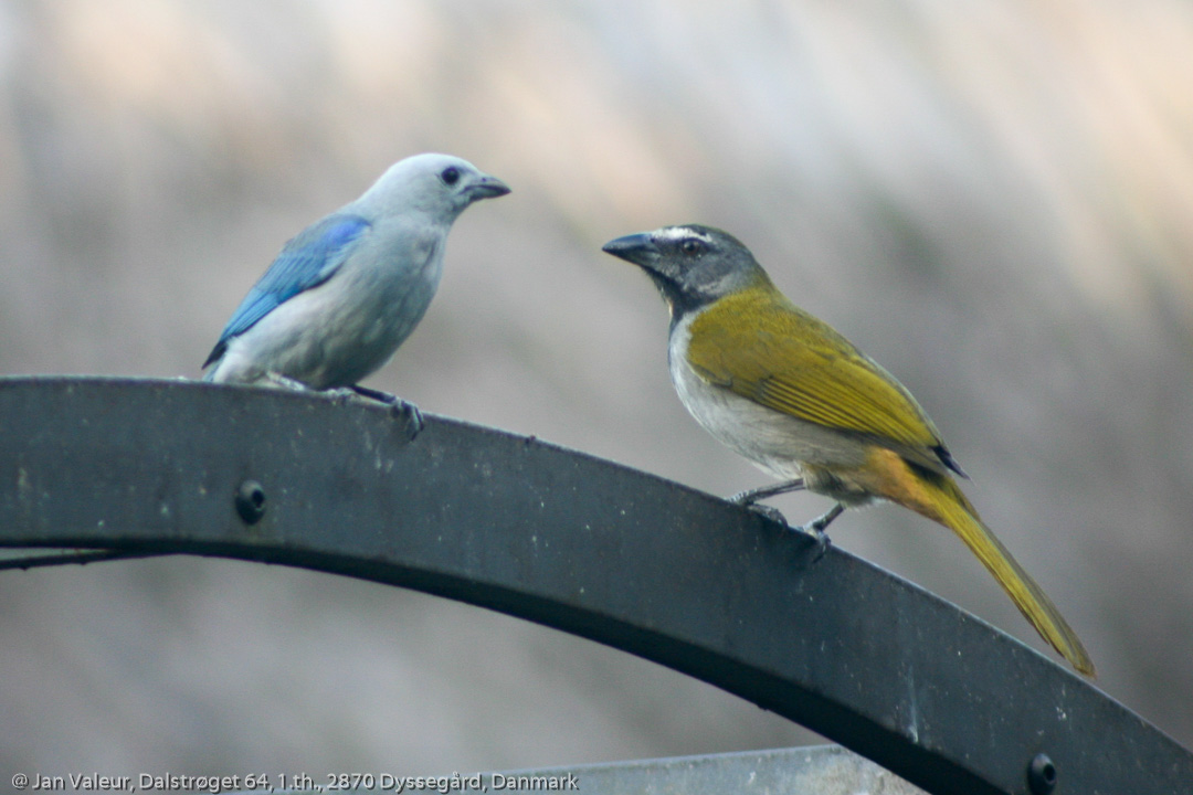 Blågrå tangar (Thraupis episcopus) og brunstrubet saltator (Saltator maximus)